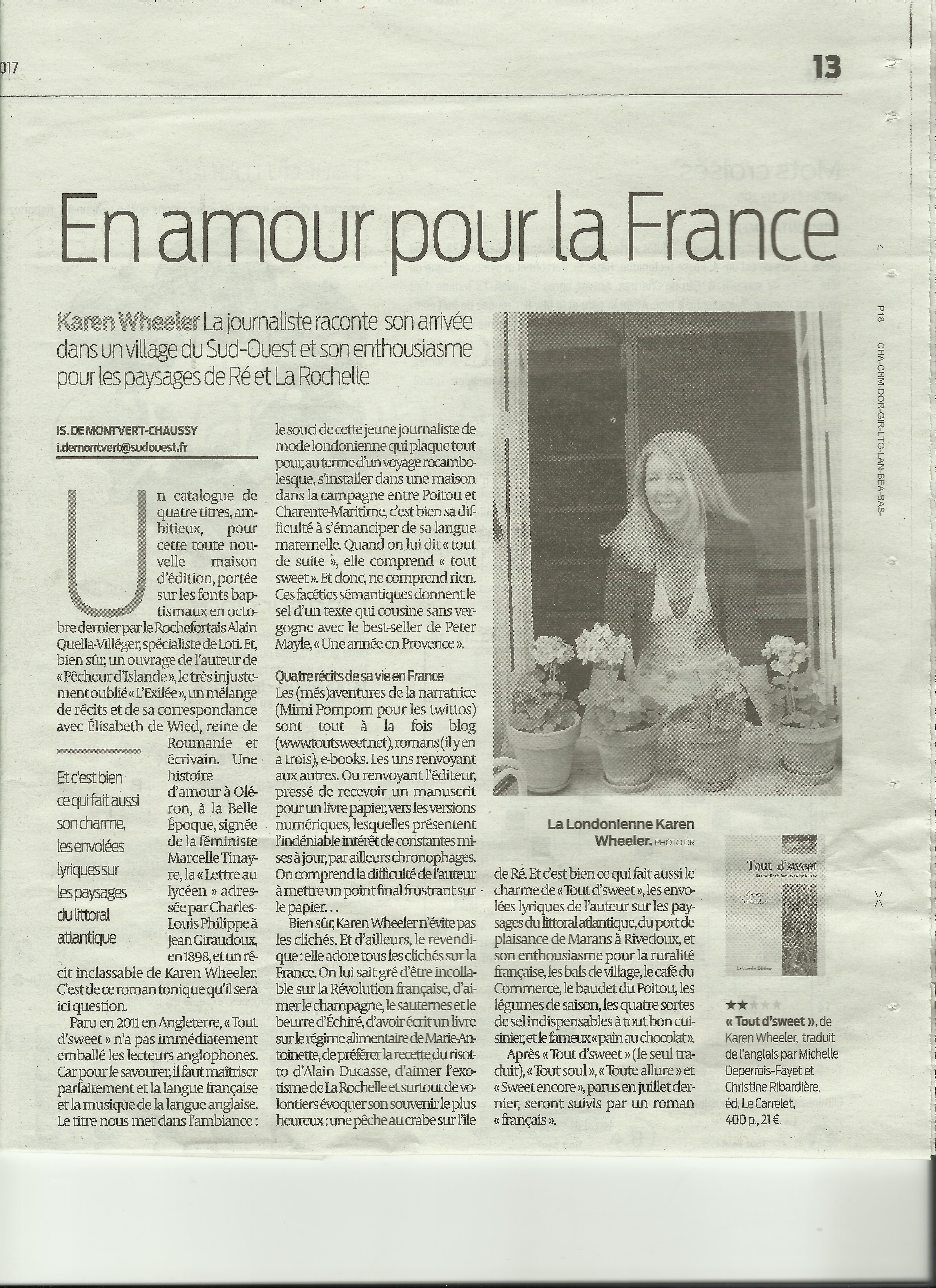 – « Ce qui fait aussi le charme de Tout d’sweeet, les envolées lyriques de l’auteur sur les paysages du littoral atlantique […] et son enthousiasme pour la ruralité française » (Sud-Ouest Dimanche, 22 janvier 2017 : Lire l’article en entier )